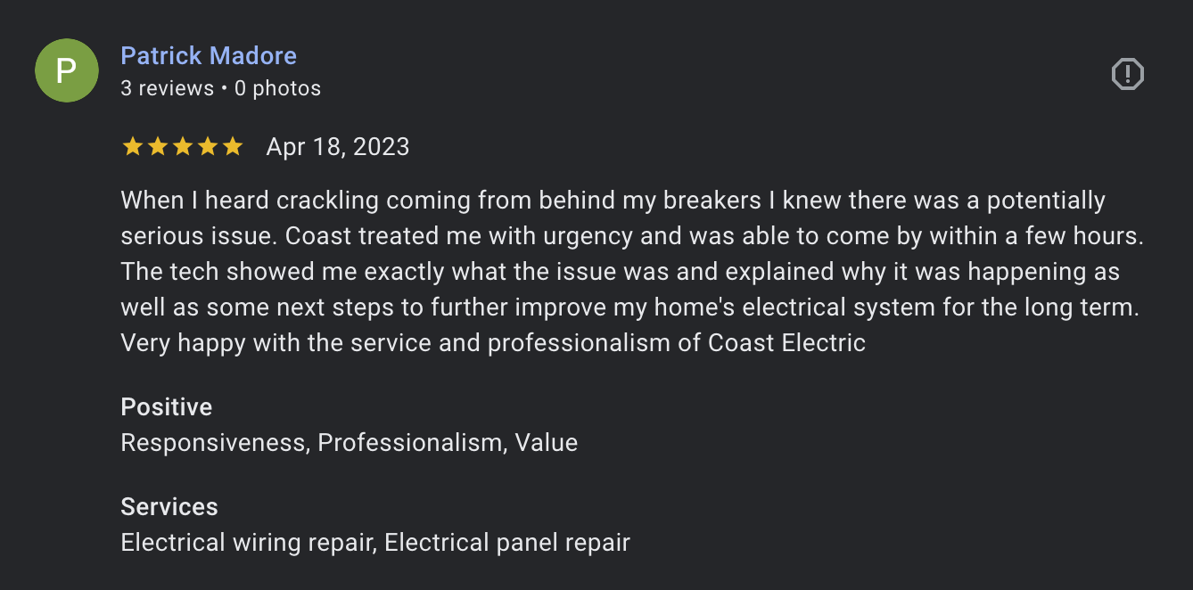 “Coast Electric is fantastic. They always take the time to get the job done right the first time. Always very nice, professional and very reasonably priced. I recommend them to all of my friends and family.”